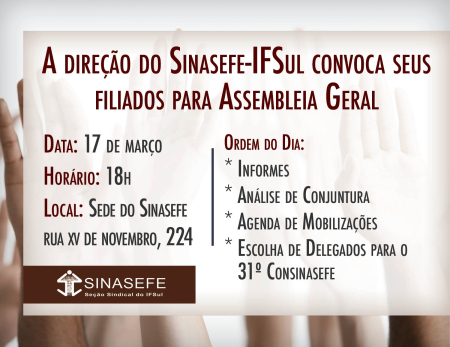 A direção do Sinasefe-IFSul convoca seus filiados para Assembleia Geral Data: 17 de março Horário: 18h Local: Sede do Sinasefe rua xv de novembro, 224Ordem do Dia: * Informes * Análise de Conjuntura * Agenda de Mobilizações * Escolha de Delegados para o 31º Consinasefe