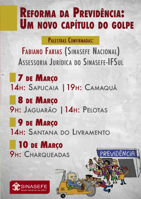 No dia 8 de março, um Seminário sobre a Reforma da Previdência será realizado em Pelotas, às 14h, e neste momento as aulas serão suspensas para possibilitar a participação de todos na atividade.